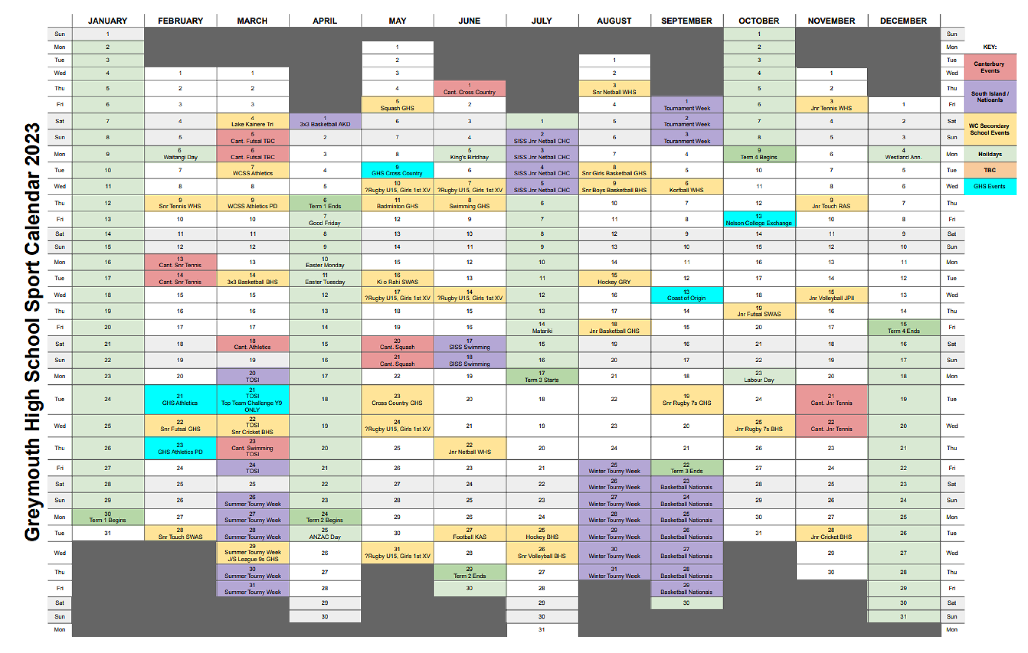 For 2023 there is HEAPS of sporting opportunities for our students that include West Coast Secondary School, Canterbury Secondary School, South Island Secondary School and National events of one day or multiday events. Check out the year calendar below!